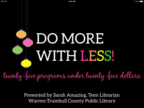 Do More with Less! 25 Programs Under $25 Dollars is a presentation at several Ohio Library Council chapter conferences I'll be doing throughout the spring. In the interest of wanting to share with the teen librarian population at large (and in the interest of saving paper), I've made the resources available here.