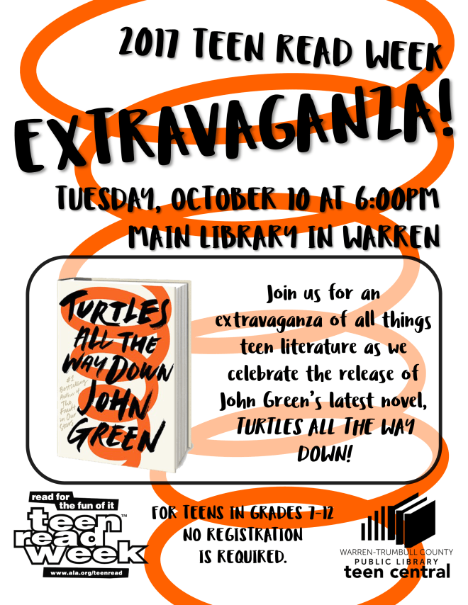 I’m not sure if Penguin did it on purpose, but releasing John Green’s new book during Teen Read Week was perfection. The fact that I’d already planned our annual Teen Read Week Extravaganza on October 10th was just icing on the cake. It’s like it was meant to be!!